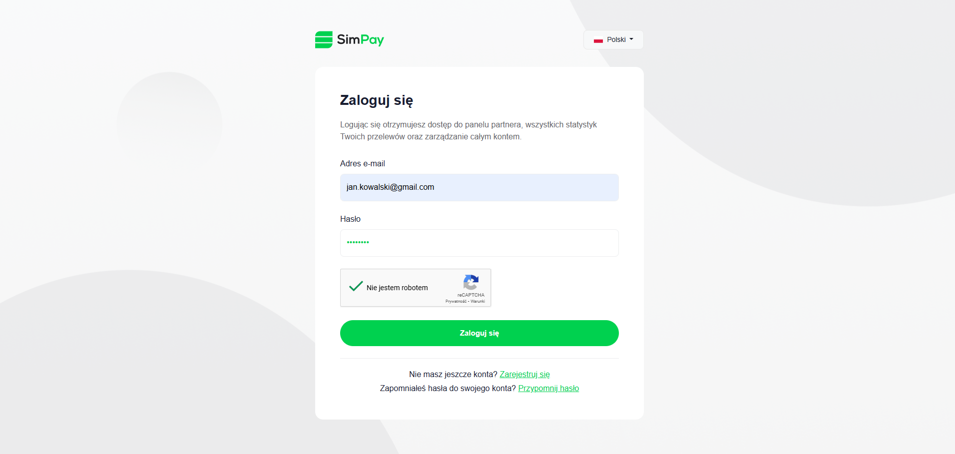 Przejdź na stronę panel.simpay.pl i załóż konto w serwisie - podaj adres e-mail, hasło, zaakceptuj regulaminy SimPay oraz naciśnij przycisk "Zarejestruj się".
